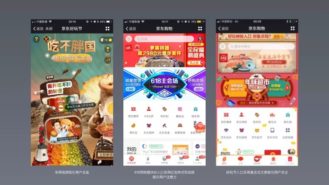 心理学研究表明最容易吸引注意的内容:任何移动的东西、人脸图片、食物、性或是和危险相关的图片、故事和噪音。因此,对于SNS自主型触发可以使用视频、大幅照片、红包和动效来吸引用户注意使其察觉感知到活动入口。同时也可采用悬念式文案引发用户好奇,吸引点击。