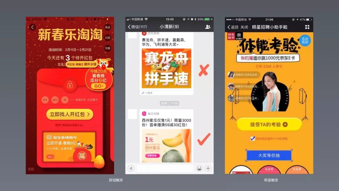 触发是促使用户发生行为的诱因,通过发出行动召唤来暗示用户。SNS是周期较短的营销活动,因此这里的触发主要指外部触发器中的人际型触发(包括朋友圈、好友分享的链接)和自主型触发(大账号推送、各种活动入口、甚至是活动首页)。